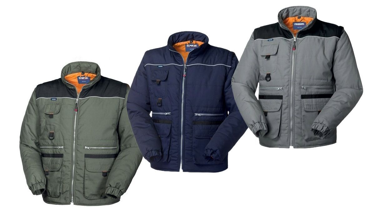 Portacellulare chiuso con aletta e velcro applicato al petto destro, una tasca a filetto accanto al portacellulare chiusa con cerniera verticale. Due tasche inferiori con soffietti laterali e scaldamani chiuse con aletta e velcro. Una tasca interna a sinistra chiusa con velcro, fondo posteriore arrotondato.